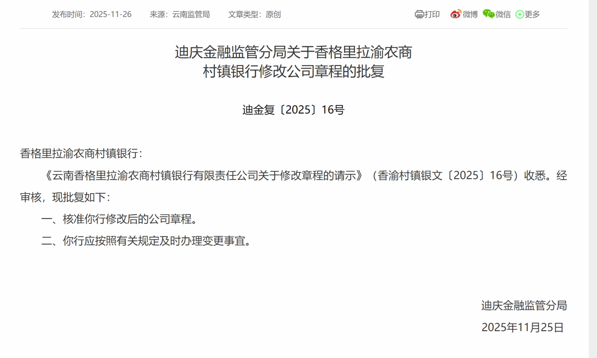 11月26日,迪庆金融监管分局发布关于香格里拉渝农商村镇银行修改公司章程的批复,核准该行修改后的公司章程。