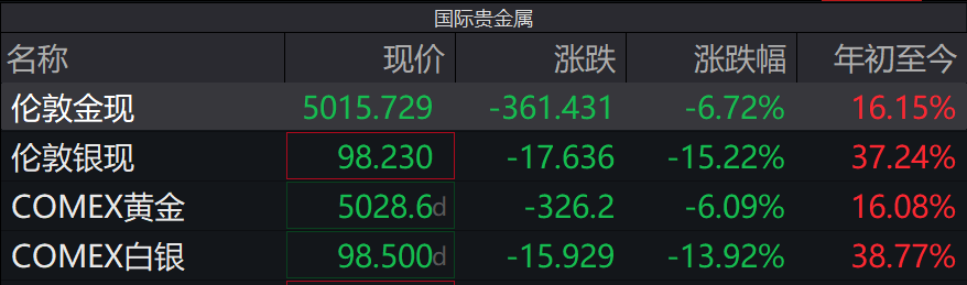 1月30日,现货黄金(伦敦金现)价格快速下行,盘中一度跌破5000美元/盎司关口,跌幅超过8%。现货白银(伦敦银现)一度重挫超过18%,跌破100美元/盎司关口。